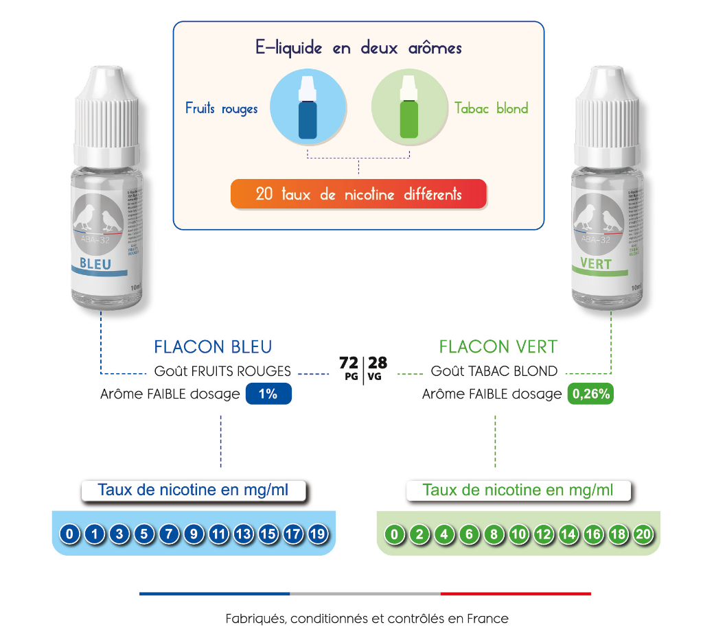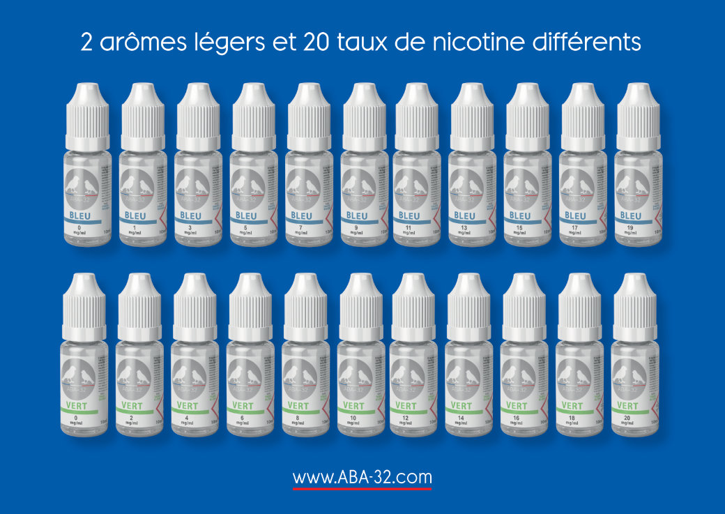 Pour arrêter de fumer et/ou pour diminuer son taux de nicotine progressivement, nous avons élaboré 2 e-liquides aux dosages aromatiques faibles et 20 taux de nicotine différents pour tous types de vapoteurs.