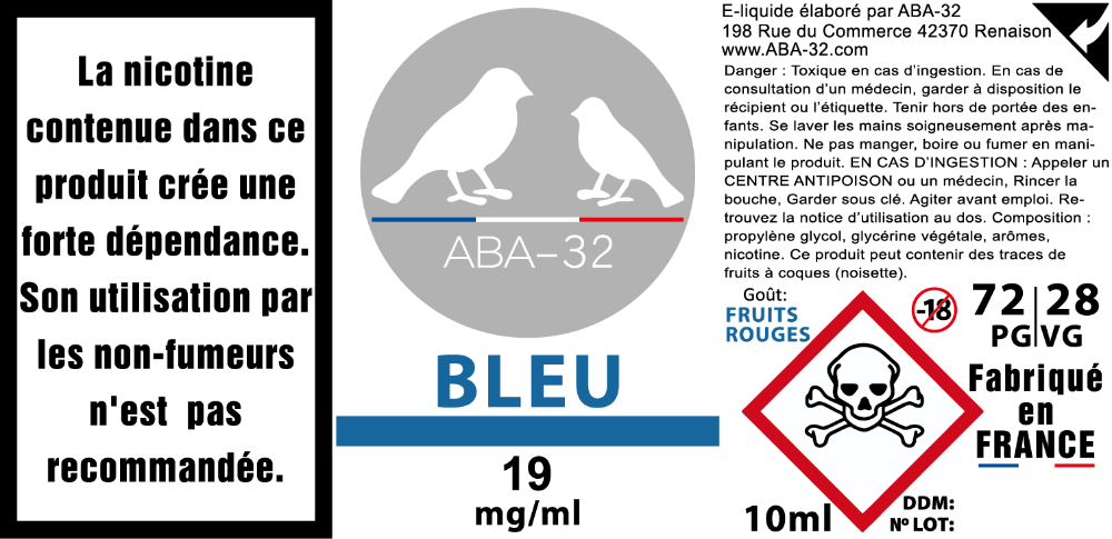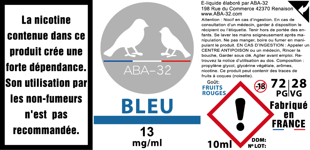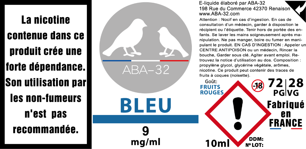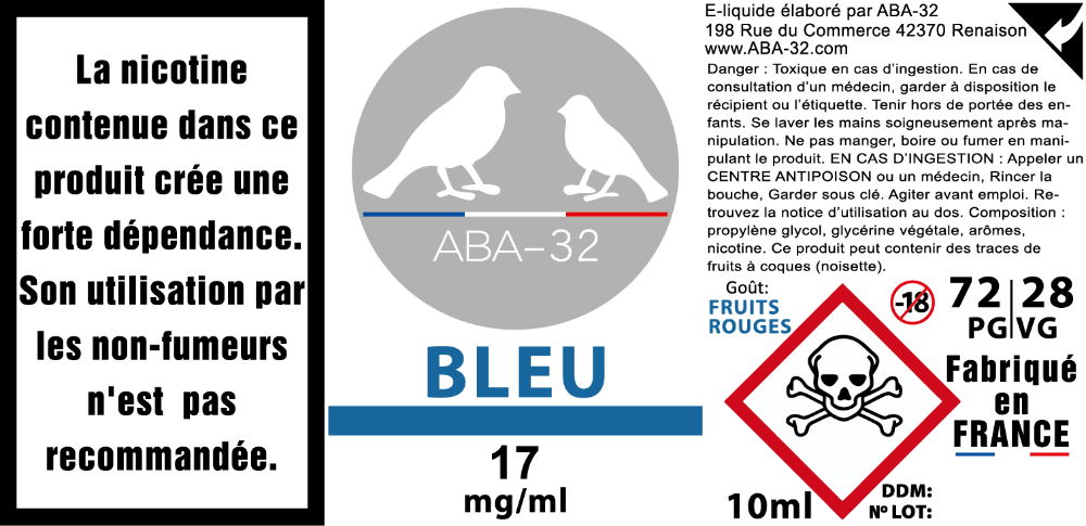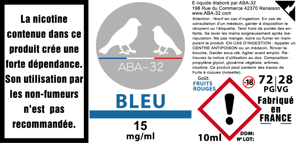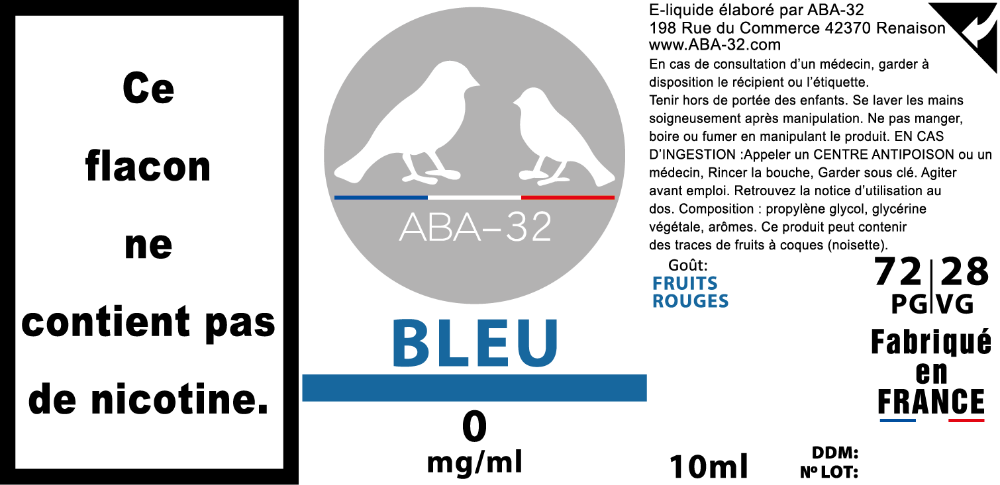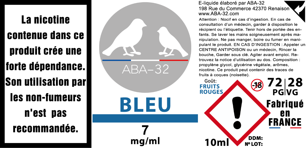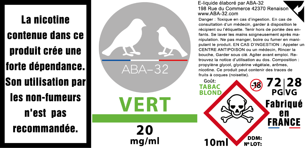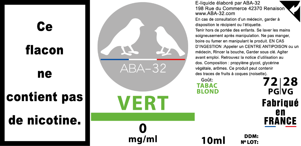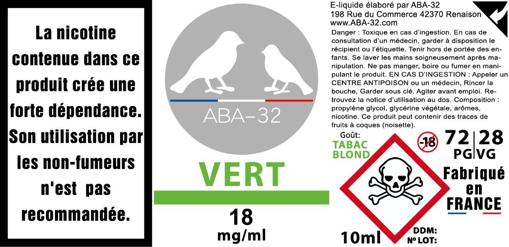 Élaboration : | E-liquide élaboré en France par ABA-32 Adresse : 198 Rue du Commerce 42370 Renaison, France Site officiel : www.aba-32.com |