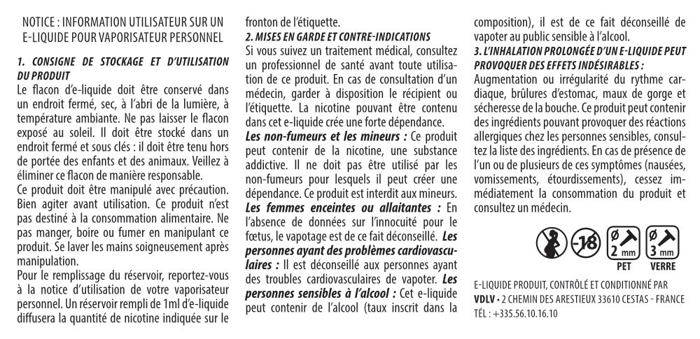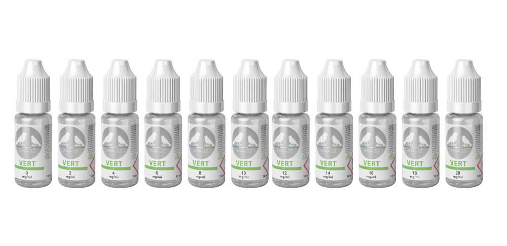 Etiquettes + Notice + Rapport d’analyses EMISSIONS VERT + Rapport d’analyses LIQUIDES VERT + Déclaration à l’Agence nationale de sécurité sanitaire de l’alimentation, de l’environnement et du travail (ANSES: voir Liste des produits du vapotage).
